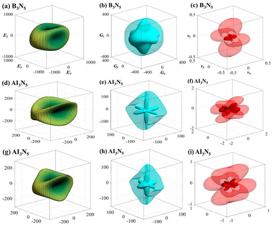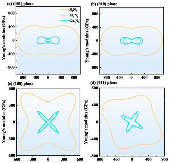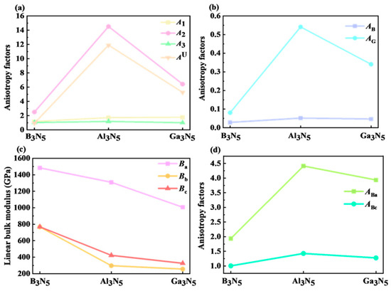 Figure 13c,d show the Ba, Bb, Bc, and ABa, ABc of C2221-B3N5, C2221-Al3N5, and C2221-Ga3N5 polymorphs, respectively. The linear bulk modulus of C2221-X3N5 (X = B, Al, Ga) polymorphs have the biggest value along the a-axes, while that along the b-axes have the lowest value. According to Figure 13d, the bulk modulus anisotropy of C2221-B3N5, C2221-Al3N5, and C2221-Ga3N5 polymorphs along the a-axes relative to the b-axes is larger than that along the c-axes relative to b-axes.