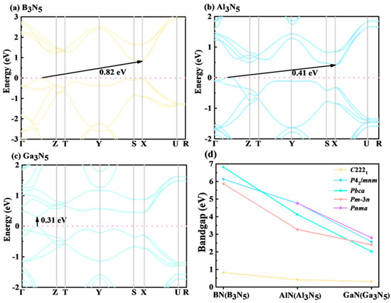 This study investigated the electronic band structure of C2221-B3N5, C2221-Al3N5, and C2221-Ga3N5 polymorphs using the HSE06 hybrid functional, as illustrated in Figure 14a–c. Semiconductors can be classified into direct band gap semiconductors and indirect band gap semiconductors based on the difference in the path of electrons jumping from the valence band to the conduction band. As can be seen in Figure 14a–c, the conduction band minima (CBM) of B3N5 and Al3N5 in the C2221 phase are at the X point, but CBM of Ga3N5 and the valence band maxima (VBM) of C2221-B3N5, C2221-Al3N5, and C2221-Ga3N5 are between the Γ point and the Z point. Due to the disparate locations of the CBM and VBM in the Brillouin zone for B3N5 and Al3N5 in the C2221 phase, their band gaps are indirect. Conversely, Ga3N5 is a semiconductor material that has a narrow and direct band gap. Figure 14d displays the band gap values of XN (X = B, Al, Ga) polymorphs in the C2221, P42/mnm, Pbca, Pm-3n, and Pnma phases. The band gaps of B3N5, Al3N5, and Ga3N5 in the C2221 phase are 0.82 eV, 0.41 eV, and 0.31 eV, respectively. They are significantly lower than XN (X = B, Al, Ga) polymorphs in the P42/mnm, Pbca, Pm-3n, and Pnma phases. The band gaps of Pbca BN, P42/mnm AlN, and Pnma GaN are 6.81 eV, 4.761 eV, and 2.80 eV, respectively. Moreover, expecting the Pm-3n BN, P42/mnm BN, P42/mnm AlN, C2221-B3N5, and C2221-Al3N5, all other XN (X = B, Al, Ga) polymorphs depicted in Figure 14d are direct band gap.