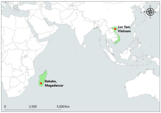 A world map of the geographical origins of the samples: Luc Yen of Vietnam and Ilakaka of Madagascar.