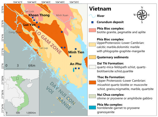 Luc Yen is located in Yen Bai Province and consists of two geological units, separated by a fault. The fault is part of the Red River shear zone, with the Day Nui Con Voi metamorphic zone to the southwest and the Lo Gam tectonic zone to the northeast (Figure 2). The corundum deposits in Luc Yen are all located in the Lo Gam tectonic zone, a unit with a structure formed by deformation superimposed on pre-existing Indochinese structures during the Himalayan orogeny [23]. The strata in this area are composed of a series of sediments, metamorphosed into marble, gneiss, calc–silicate, dolomite, and amphibolite, which are sometimes intruded by granite and pegmatite dikes [24]. The mineralized marble belt where the Luc Yen corundum deposit is located is similar to the geological conditions where rubies are mined in the Mogok area of Myanmar and the Hunza Valley of Pakistan [20].