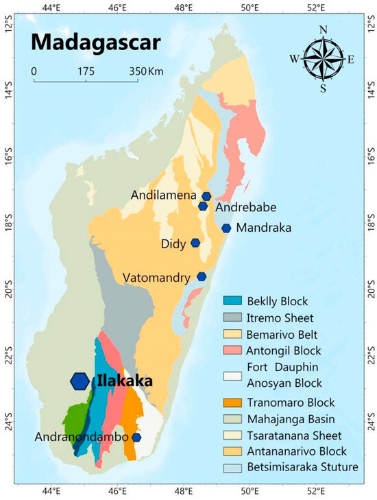 About 750–500 million years ago, Madagascar was part of Gondwana’s supercontinent, sandwiched between East Africa, southern India, and Sri Lanka. Today, this region is known as the Mozambique (Pan-African) Orogenic Belt, and it is home to the world’s richest corundum deposits. Many areas of the belt are now the world’s largest producers of rubies and sapphires. Ilakaka is located in the southern part of Madagascar (Figure 3), where colored sapphires are produced in high volumes, with mining and trade concentrated in and around Ilakaka [26].