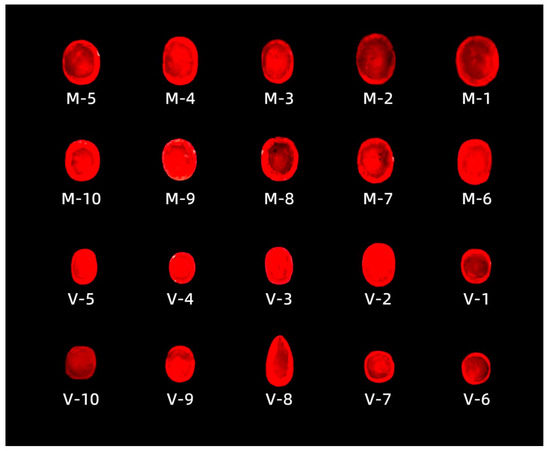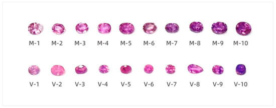 A total of 20 sapphire samples (10 from Vietnam and 10 from Madagascar) were collected and examined in this study. These sapphire samples are all faceted gemstones weighing from 0.36 to 1.59 ct (Figure 4), and they are pink to purple in color. The samples from Vietnam were numbered from V-1 to V-10, and the samples from Madagascar were numbered from M-1 to M-10. The Vietnamese samples often exhibit a characteristic foggy appearance, with V-1, V-2, V-3, V-5, and V-10 being distinctly foggy, and V-4 and V-6 having moderately foggy appearances.
