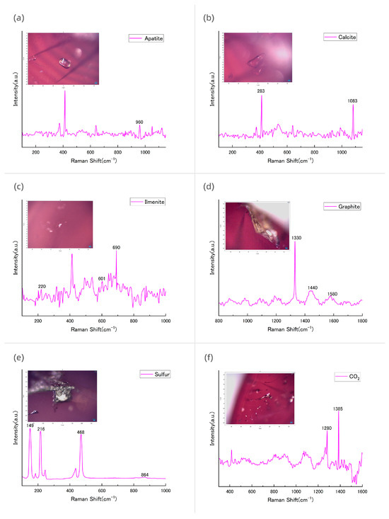 Inclusions detected using Raman spectroscopy in samples from Vietnam: (a) apatite inclusion and its Raman spectrum; (b) calcite inclusion and its Raman spectrum; (c) ilmenite inclusion and its Raman spectrum; (d) graphite inclusion and its Raman spectrum; (e) sulfur inclusion and its Raman spectrum; (f) elongated gas–liquid inclusions and Raman bands of their CO2 vibration modes.