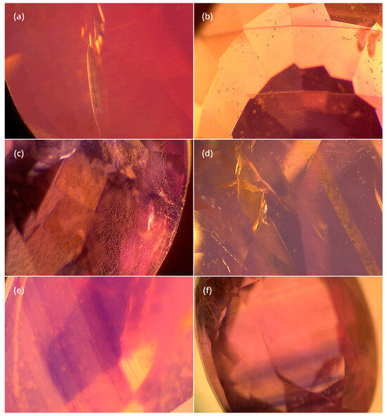 Vietnamese pinkish-purple sapphires are characterized by distinctive inclusions: white, colorless, and bluish-purple banded inclusions are observed in V-3, V-9, and V-10, and cannot be clearly seen under a high-magnification microscope (Figure 7e,f). Previously, other researchers also observed the presence of bluish-purple zoning in a large number of Vietnamese rubies, indicating that these zones are typical representatives of Vietnamese materials [9,20]. However, they are not unique to Vietnamese gemstones; similar zones have also been observed in some rubies from Afghanistan and Nepal, as well as in pink sapphires from Montana and Sri Lanka [20].