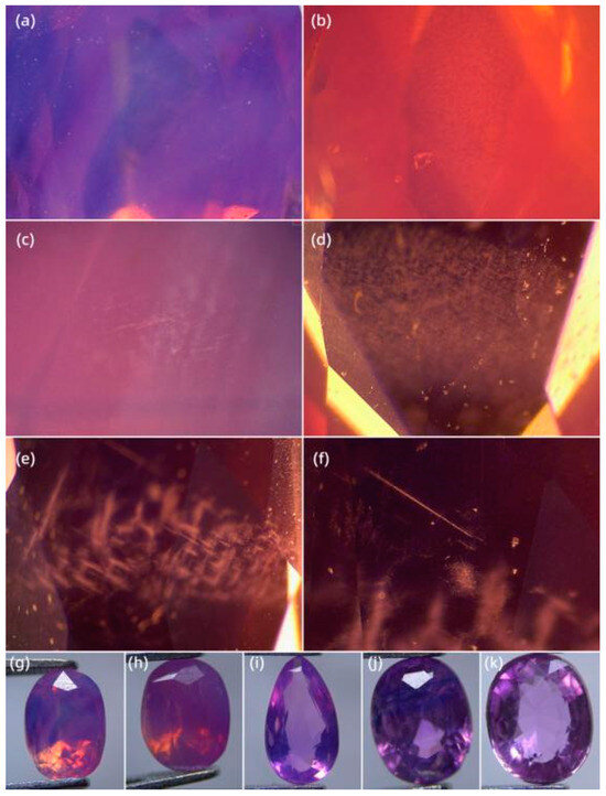 Cloud-like inclusions are also common in the Vietnamese samples (Figure 8). There are two types: one type has irregular contours, such as those observed in V-3, and is composed of small white particles that are uniformly distributed throughout the cloud. When using fiber optic light, the cloud-like inclusions appear blue (Figure 8a), and the sample exhibits orange iridescence (Figure 8g). The second type of cloudy inclusion, such as those shown in V-5 (Figure 8b) and V-8 (Figure 8d,e), is composed of larger white particles with indistinct contours and areas of different densities. Upon further magnification, the samples were found to consist of various lengths of small needle-like inclusions and dust-like inclusions arranged in a roughly oriented manner (Figure 8c,f). Due to the extremely small size of the inclusions within the experimental samples, Raman spectroscopy was unable to accurately determine their composition. Nevertheless, according to the relevant literature, these minute needle-like particles have been identified as rutile in corundum specimens from various regions [20]. Among them, the V-5 particles exhibit a smaller size and denser cloud formation, with the samples displaying an orange iridescent color (Figure 8h), while V-8 has more distinct particles and does not exhibit any orange iridescence (Figure 8i). In addition, the Vietnamese samples without cloud-like inclusions do not exhibit any orange iridescence (Figure 8j); the samples from Madagascar do not have cloud-like inclusions and do not exhibit any orange iridescence (Figure 8k). It is hypothesized that the orange iridescence can be attributed to light scattering caused by minute inclusions within the sample.