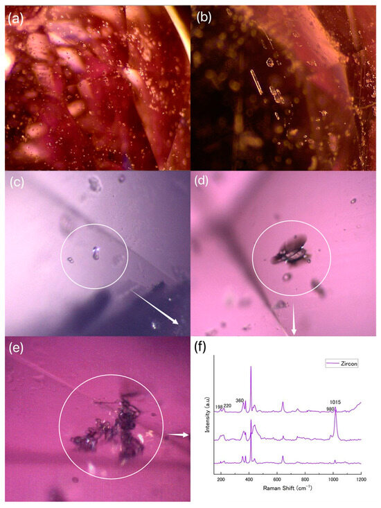 Colorless transparent solid inclusions in the Madagascan samples: (a) the Madagascan samples are filled with colorless transparent crystal inclusions; (b) prismatic, hexagonal plate-like colorless transparent crystal inclusions; (c–e) isolated zircon, zircon with tension cracks, and clusters of zircon; (f) their Raman spectra.