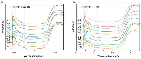 The infrared spectra of the pink sapphires from Vietnam and Madagascar were measured (Figure 11). The infrared spectra of the samples from both origins show the corundum pattern, with the Vietnamese samples having a stronger band at 512–518 cm−1. The infrared spectra measured in this study show four absorption bands at 400–800 cm−1—a strong band at 487 cm−1, a strong band at 505–514 cm−1, a shoulder band at 570–586 cm−1, and a band at 630–640 cm−1—all of which are absorption bands of Al-O in Al2O3.