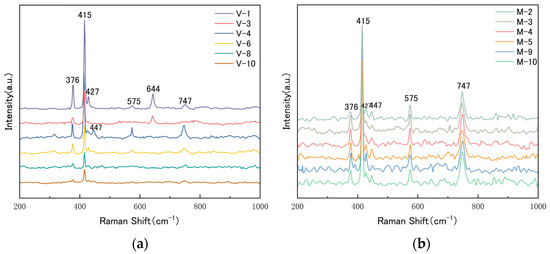 The Raman spectra of pink sapphires from Vietnam and Madagascar have a similar pattern (Figure 13). The purple sapphires from Vietnam and Madagascar both exhibit typical bands at 376 cm−1, 415 cm−1, 427 cm−1, 447 cm−1, 575 cm−1, and 747 cm−1. However, in some Vietnamese samples, the characteristic peaks at 447 cm−1 and 575 cm−1 disappear, and a new peak appears at 644 cm−1. This difference may be caused by the different relative angles between the laser beam and the samples, which are due to the anisotropy of the sapphires. The Raman spectra of the samples from both locations, as well as those reported in other studies, show significant similarities, with only slight differences in the intensity and wavenumber of the Raman peaks.