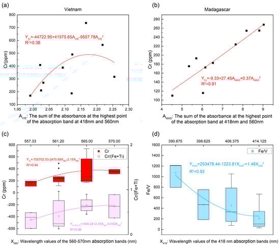 (a) Relationship between AVIE and Cr contents in samples from Vietnam; (b) relationship between AMAD and Cr contents in samples from Madagascar; (c) relationship between X560 and Cr and Fe+Ti contents in 20 samples; (d) relationship between X418 and the values of Fe/V in 20 samples.