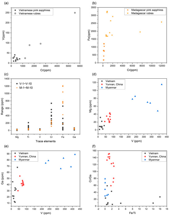(a) Cr and V components of pink sapphires from Vietnam and rubies of the same geographic origin; (b) Cr and Fe components of Madagascan pink sapphires and rubies of the same geographic origin; (c) LA-ICP-MS data for the main trace element analysis of the 20 sapphire samples; (d) the relationship between the Mg and V content of Vietnamese pink-purple sapphires and pink and red corundum from Yunnan and Myanmar; (e) the relationship between the Ga and V content of Vietnamese pink-purple sapphires and pink and red corundum from Yunnan and Myanmar; (f) the relationship between the ratio of Cr/Ga and Fe/Ti of Vietnamese pink-purple sapphires and pink and red corundum from Yunnan and Myanmar.