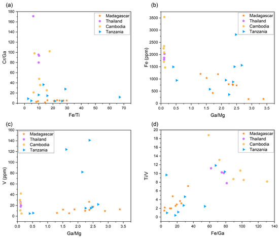 (a) The relationship between the ratio of Cr/Ga and Fe/Ti of Madagascar pink-purple sapphire and pink and red corundum from Thailand, Cambodia, and Tanzania; (b) the relationship between the ratio of Ga/Mg and Fe content of Madagascar pink-purple sapphire and pink and red corundum from Thailand, Cambodia, and Tanzania; (c) the relationship between the ratio of Ga/Mg and V content of Madagascar pink-purple sapphire and pink and red corundum from Thailand, Cambodia, and Tanzania; (d) the relationship between the ratio of Fe/Ga and Ti/V of Madagascar pink-purple sapphire and pink and red corundum from Thailand, Cambodia, and Tanzania.