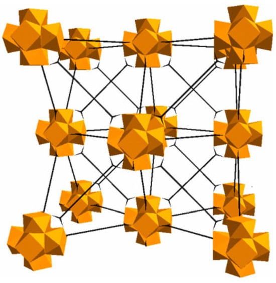 The crystal structure of UiO-66 is shown in Figure 1, which was taken from a cif file saved under Cambridge Crystallographic Data Center (CCDC) 837796. The synthesis of UiO-66 and its manganese-doped derivatives followed a solvothermal method. Initially, 1.16 g of zirconium chloride (ZrCl4) and 0.83 g of terephthalic acid (BDC) were dissolved in 150 mL of N,N-dimethylformamide (DMF). To this solution, 15.01 g of acetic acid was added, and the mixture was stirred for 30 min. The resulting solution was transferred into a 200 mL solvothermal reactor and heated at 120 °C for 24 h. After cooling to room temperature, the product was washed several times with DMF and methanol and then dried at 80 °C for 12 h. The sample obtained was denoted as UiO-66 [21].