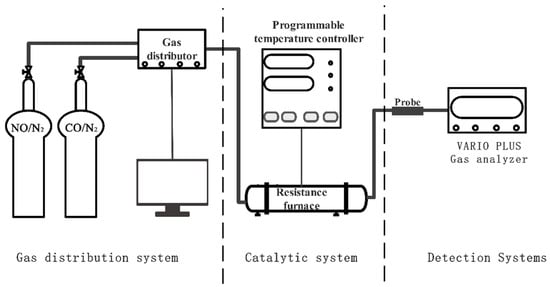 The experimental setup for evaluating NO conversion is depicted in Figure 2, which consists of three primary subsystems: the gas distribution system, the catalytic reaction system, and the detection system. The gas distribution system was equipped with a gas mixing unit and steel cylinders containing CO/N2 and NO/N2 gas mixtures. The catalytic reaction system included a fixed-bed reactor housed within a tubular resistance furnace. The detection system employed a VARIO PLUS enhanced flue gas analyzer (Elementar, Langenselbold, Germany) for real-time gas composition monitoring.