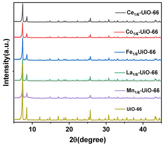 The influence of different metals on the crystal structure of UiO-66 was shown in Figure 3. The UiO-66 catalyst had seven main characteristic peaks at 2θ = 7.4°, 8.5°, 14.8°, 17.1°, 25.8°, 30.8°, and 43.6°, corresponding to the (111), (200), (222), (400), (442), (711), and (664) crystal planes, respectively. After the doping experiment, the peak intensity generally decreased. However, the characteristic peaks of Mx-UiO-66 were in good agreement with the peaks of the UiO-66, which verified that the synthesized materials were still the same structure of UiO-66. When metal was doped into UiO-66, there was no corresponding metal oxide peak in the main diffraction peak, indicating that the metal element might be incorporated into the crystal lattice of UiO-66 rather than in the form of oxide. In addition, the metal doping modification would not cause the phase change of the UiO-66 crystal, and the XRD characteristic peak positions before and after doping remained unchanged [9].