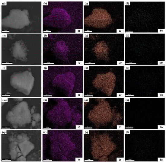 SEM-EDAX mapping of M1/6-UiO-66: (a–d) Fe-doping, (e–h) Mn-doping, (i–l) Co-doping, (m–p) Ce-doping, (q–t) La-doping.