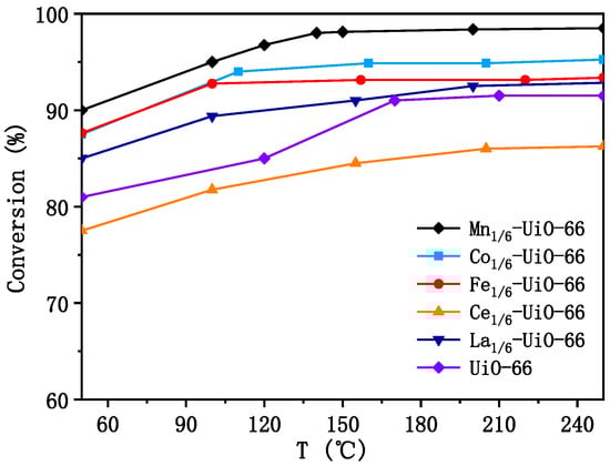 When the metals Co, Fe, Mn, and La were incorporated, the catalytic performance of the UiO-66 catalyst improved. Notably, Mn-doped UiO-66 exhibited the highest catalytic activity, achieving a NO conversion of 98% at 150 °C. And the NO conversion was ranked as Mn1/6-UiO-66 > Co1/6-UiO-66 > Fe1/6-UiO-66 > La1/6-UiO-66 > UiO-66 > Ce1/6-UiO-66 (Figure 6). In addition, EDS analysis showed that metal ions were difficult to dope into the metal-organic framework for stable structure of UiO-66, and therefore, the doped metal content was low.