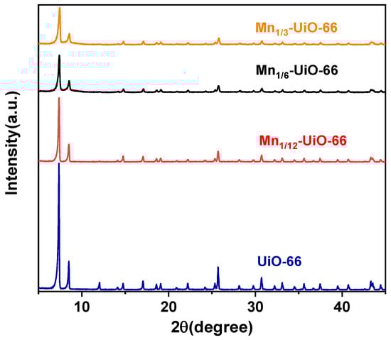 The characteristic peaks of Mnx-UiO-66 were in good agreement with the previous peaks as shown in Figure 7. When Mn was doped into UiO-66, the main diffraction peaks were similar to those of UiO-66. There were no diffraction peaks for Mn or MnOx, indicating that the doped Mn was low-load and highly dispersed. In addition, the peak intensity of catalysts weakened with the increase in Mn content [22].