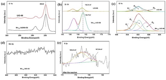 Figure 9 and Table 3 show the XPS spectra and corresponding surface element composition of UiO-66 and Mn1/6-UiO-66. Mn1/6-UiO-66 had also been tested after its sulfur resistance for 8 h to explore the S content on its surface [21]. The peak position of C in the C 1s XPS spectrum of all samples was at 284.8 eV, as displayed in Figure 9a. Figure 9b shows the XPS spectrum of Zr 3d. The Zr 3d5/2 peak position of Mn1/6-UiO-66 and UiO-66 was at 182.7 eV and 182.9 eV, respectively. The small amount of Mn incorporated into the UiO-66 lattice might have altered the interaction between Mn and Zr, resulting in a shift in binding energy. Although the theoretical atomic ratio of Zr/Mn was 6:1 during the synthesis process, a large amount of Mn did not enter the crystal lattice, and the elemental analysis of the XPS surface showed that Mn was only 0.2%. Figure 9c was the O 1s spectrum of the catalysts. The O1s peak of Mn1/6-UiO-66 could be divided into three peaks. The peak position at 532.5 eV belong to the lattice oxygen atom, which was defined as Oβ, referring to the Zr-O or Mn-O bond. The 531.8 eV peak was attributed to chemically adsorbed oxygen, which defines Oα, referring to the C=O bond. The peak at 532.5 eV was attributed to OH or defect oxygen, which was defined as Oα′. After the reaction, the percentage of Oα decreased significantly for the consuming of adsorbed oxygen during the reaction. The peak area of Mn1/6-UiO-66 increased significantly after doping. Oβ/Oα cannot directly explain the catalytic performance of the material, but it still has a certain reference value. The NO conversion efficiency increased after doping, which proved that doping improves the activity of the catalyst [22]. The Mn 2p spectrum in Figure 9d identified the existence of the Mn. Figure 9e displays a small amount of S deposited on the surface of the catalyst anti-sulfidation for 8 h. The peaks of S were fitting at 169.2 and 167.9 eV, which were attributed to SO42−, SO32− or SO2, respectively.