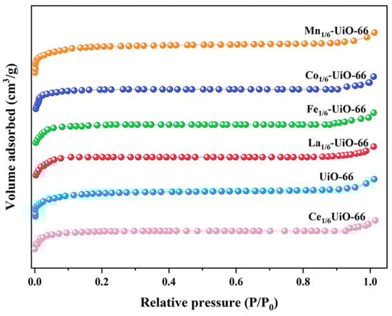 N2 adsorption/desorption isotherms of UiO-66 and (Mn, Co, Fe, La, Ce)1/6-UiO-66.