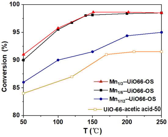As shown in Figure 11, the NO conversion efficiency of Mnx-UiO-66 gradually increased with the rise in doping concentration. However, the NO conversion of Mn1/3-UiO-66 was comparable to that of Mn1/6-UiO-66. The NO conversion efficiency of Mn1/6-UiO-66 reached 98% at 150 °C. Overall, the NO conversion achieved via the one-step solvothermal method was significantly enhanced compared to the undoped sample. This improvement can be attributed to several factors, including a substantial increase in specific surface area and the synergistic catalytic effect of the doped metal. To minimize metal wastage during the reaction, the ZrCl4/MnCl2 molar ratio was optimized at 6:1.