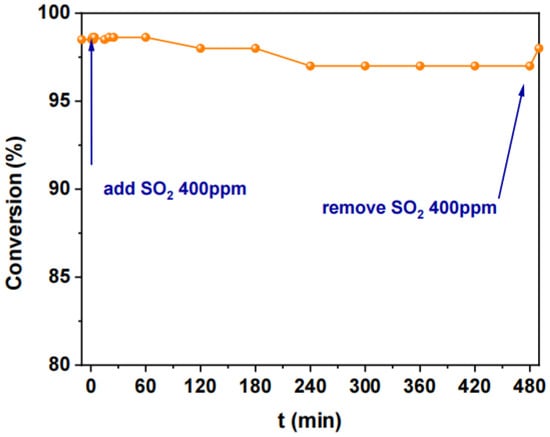 In order to investigate the anti-sulfur performance of Mn1/6-UiO-66, SO2 was passed into the quartz tube for 8 h during the denitration process at 150 °C. As shown in Figure 12, Mn1/6-UiO-66 exhibited an excellent anti-sulfur activity. In detail, the denitrification rate dropped from 98% to 96%, and the denitrification performance stabilized at 96% in the 8 h sulfur resistance test with the presence of SO2. Moreover, the denitrification rate returned to 98% after SO2 was removed.