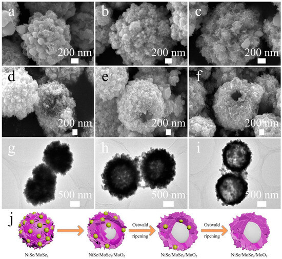 (a–f) FESEM and (g–i) TEM images of the as-synthesized material. The synthesized sample at 4 h (a,d,g), (b,e,h) at 8 h and (c,f,i) at 12 h. (j) The schematic representation of the construction of NiSe/MoSe2/MoO2 3D HHM. Reproduced with permission [32].