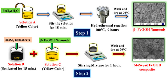 The synthesized materials were employed for asymmetric super-capacitor (ASC) applications, achieving a high specific capacitance of 1061 F·g−1 at a current density of 2 A·g−1. They also revealed excellent cycling stability, retaining 93.9% of their initial capacitance after 10,000 cycles, alongside an energy density of 48.1 Wh·kg−1 at a power density of 428 W·kg−1. The superior electrochemical activity is attributed to the large specific surface area and well-developed mesoporous structure, which enhance the contact area among the electrolyte and active material while reducing the ion transport path and time. In other reports [33], a hydrothermal approach was adopted for the formation of a distinctive 2D-2D Co(OH)2-MoSe2 hybrid nanosheets. These nanosheets showcased excellent electrical performance with a specific capacitance of 541.55 F·g−1 at 1 A·g−1 in a three-electrode setup. Impressively, the hybrid material retained 91.4% of its capacitance after 3000 cycles. An ASC fabricated with Co(OH)2-MoSe2 hybrid nanosheets and activated carbon is a positive and negative electrode material, which can achieve an energy density of 30.12 Wh·kg−1 at a power density of 985.74 W·kg−1. Furthermore, the ASC device engaged 86.2% of its initial capacitance after 3000 cycles, demonstrating the material’s probable for the application of high-performance energy storage. Also, the sodium-ion capacitors have also gained prominence with the integration of few-layer MoSe2 nanosheets. In a study by Zhao et al. [34], MoO2@MoSe2/rGO was used as an anode material for sodium-ion capacitors. Improved sodium-ion diffusion and electron transfer were primarily ascribed to the synergistic belongings of metallic MoO2 and graphene. Density functional theory (DFT) simulations and characteristic electrochemical impedance spectroscopy (EIS) analyses further validated the electronic coupling between MoO2 and MoSe2 at their interface. The anode material achieved a sodium-ion storage capacity of 394 mAh.g−1 at 3.2 A·g−1 and displayed negligible capacity degradation over 5000 cycles at 5 A·g−1. Upon assembling a sodium-ion capacitor with activated carbon as the counter electrode, it demonstrated an energy density of 51 Wh·kg−1 at 7920 W·kg−1. This dual-interface engineering strategy covers the way of a rational strategy of next-generation composite electrodes for sodium-ion capacitors and batteries. An in situ selenization route was employed to fabricate layered 2H-MoSe2 nanosheets, which were subsequently evaluated for their electrochemical charge storage properties [35]. Structural and morphological examinations confirmed the effective synthesis of these nanosheets. In a three-electrode cell setup with 2 M KOH electrolyte, the MoSe2 nanosheets exhibited a specific capacity of 46.22 mAh.g−1 at 2 A·g−1, along with impressive cyclic stability over 2000 charge–discharge cycles. A symmetric supercapacitor constructed with MoSe2 nanosheets displayed a specific capacitance of 4.1 F·g−1 at 0.5 A·g−1, with capacitance retention reaching 105% after 10,000 cycles. This improvement was likely due to the nanosheet activation after initial cycles and a coulombic efficiency of nearly 100%. Gowrisankar et al. [36] developed Mo- and W-based dichalcogenides for supercapacitor applications. By incorporating 2D reduced graphene oxide (rGO) nanosheets into Mo dichalcogenides via an effective one-pot hydrothermal synthesis way, they achieved a MoSSe/rGO composite with a specific capacitance of 373 F·g−1 at 1 A·g−1. The synergistic contact between the materials, facilitated by electrostatic forces, significantly enhanced cyclic durability and structural robustness, making the composite highly reliable for supercapacitor applications. For energy storage purposes [37], a liquid exfoliation technique was employed to synthesize few-layer MoSe2 nanosheets. When tested as an electrode material for super-capacitors, these nanosheets delivered a specific capacitance of 15 F·g−1 at 0.1 A·g−1 and maintained 95% efficiency over 12 cycles. The sheet-like morphology provided a supreme electrolyte-accessible surface area, enhancing electrochemical performance. A hydrothermal-assisted chemical blending method was utilized to synthesize a MoSe2 nanoflower-FeOOH nanorod hybrid composite [38]. The formation of the FeOOH and MoSe2/FeOOH composite is demonstrated in Figure 3. After physicochemical characterizations, the produced materials were adopted as super-capacitor electrode materials. When integrated into a symmetric super-capacitor configuration, the device displayed a specific capacitance of 132 F·g−1 at 1 A·g−1, with minimal capacitance loss over 3000 cycles. Impressively, the device powered a panel of 42 red LEDs continuously for 10 min, showcasing its practical applicability. Additionally, the device achieved an energy density of 18.3 Wh·kg−1 at a power density of 1174 W·kg−1.