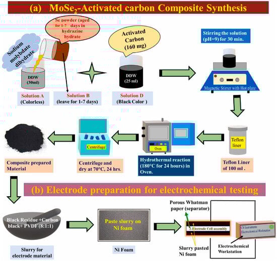 In another work by Tanwar et al. [39], the aging effects of selenium powder were explored for its application in super-capacitors. The schematic graph in Figure 4a shows the formation of a MoSe2 and activated carbon (MoSe2/AC) composite, whereas Figure 4b demonstrates the preparation of a super-capacitor electrode. The MoSe2/AC composite was made via a facile hydrothermal method, and its properties were analyzed using numerous characterization techniques. Among the synthesized composites, M6AC exhibited superior performance, achieving a specific capacitance of 394 F·g−1 at a current density of 1 A·g−1, with energy and power densities of 55 Wh·kg−1 and 845 W·kg−1, respectively. In practical applications, this composite was utilized in a symmetric cell capable of illuminating 26 red LED bulbs connected in parallel.
