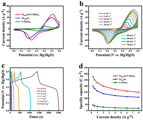 A Ni0.85Se/N-MoSe2 hybrid material was synthesized via the facile hydrothermal method with formamide and water as mixed solvents [40]. The synthesized samples (Ni0.85Se/N-MoSe2, Ni0.85Se, and N-MoSe2) were used as electrode materials for super-capacitor applications. The cyclic voltammetry (CV) results for Ni0.85Se/N-MoSe2, Ni0.85Se, and N-MoSe2 at a scan rate of 40 mV/s are shown in Figure 5a. The higher electrochemical activity for Ni0.85Se/N-MoSe2 was observed and CV curves of the Ni0.85Se/N-MoSe2 at different scan rates were collected as shown in Figure 5b. The synergistic effect and N-doping significantly enhanced energy storage capabilities. The GCD curves of the Ni0.85Se/N-MoSe2 at different current densities are exhibited in Figure 5c. It can be seen that higher electrochemical performance was observed at 0.25 A·g−1. In addition, the specific capacity versus current density graph is depicted in Figure 5d. The hybrid achieved a specific capacity of 276.5 C·g−1 at 250 mA·g−1, while an asymmetric super-capacitor fabricated with this material showed a specific capacitance of 58.4 F·g−1 at 500 mA·g−1, an energy density of 20.8 Wh·kg−1, and remarkable cycling stability, retaining performance after 15,000 cycles.