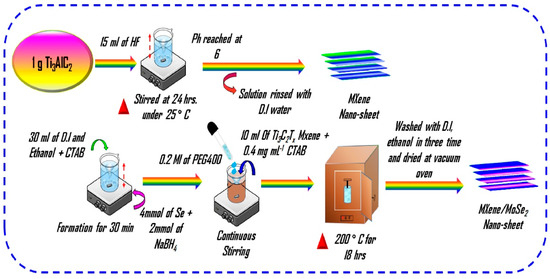 In a research work proposed by Arulkumar et al. [42], the MoSe2-MXene hybrid nanostructure was synthesized via a hydrothermal method, as shown in Figure 6. The proposed electrode material was used as super-capacitor material and showed a specific capacitance of 1531.2 F·g−1 at 1 A·g−1. Even at a high current density of 5 A·g−1, it retained 94.1% of its capacitance after 10,000 cycles. The MXene incorporation enhanced conductivity, charge transfer, and active site availability.