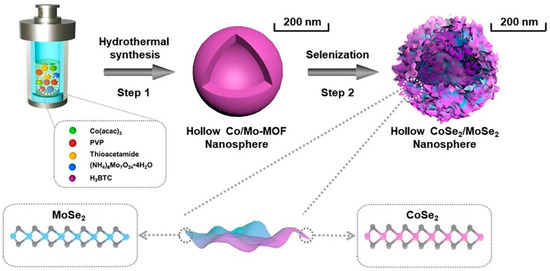 The schematic picture shows the formation of hollow CoSe2/MoSe2 nanospheres. Reproduced with permission [55].