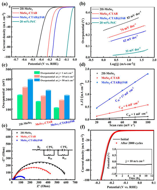 HER activity of 2H MoSe2, MoSe2-CTAB, and MoSe2-CTAB@F68: (a) LSV responses and (b) Tafel slopes of the 2H MoSe2, MoSe2-CTAB, MoSe2-CTAB@F68, and 20 wt % Pt/C. (c) Overpotential values of 2H MoSe2, MoSe2-CTAB, and MoSe2-CTAB@F68 at 1, 10 and 50 mA/cm2. (d) Linear fits graph of the half-capacitance current density versus scan rates for the determination of Cdl. (e) EIS graphs of the 2H MoSe2, MoSe2-CTAB, MoSe2-CTAB@F68. Inset: equivalent circuit model. (f) LSV graph for stability test. Reproduced with permission [59].