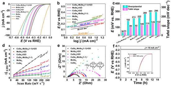 According to Zhu et al. [65], various catalysts were employed for HER in an alkaline medium. Figure 10a shows the LSV data of the commercial Pt/C and suggests the presence of the lowest overpotential value. Tafel graphs of the various catalysts are shown in Figure 10b, whereas overpotential values of the various catalysts have been exhibited in Figure 10c. It could be seen that CoSe2-MoSe2 (1–1)/rGO has relatively better electrochemical activity towards HER, and a low overpotential of 182 mV was obtained at 10 mA/cm2. This overpotential value for CoSe2-MoSe2 (1–1)/rGO catalyst was superior compared to the other catalysts (CoSe2/rGO, MoSe2/rGO, MoSe2, CoSe2-MoSe2 (1–1), and CoSe2), as shown in Figure 10c. The Cdl values of the various catalysts are summarized in Figure 10d and it was observed that CoSe2-MoSe2 (1–1)/rGO has larger Cdl value compared to the other catalysts (CoSe2/rGO, MoSe2/rGO, MoSe2, CoSe2-MoSe2 (1–1), and CoSe2). This reveals that CoSe2-MoSe2 (1–1)/rGO has higher ECSA compared to the other catalysts (CoSe2/rGO, MoSe2/rGO, MoSe2, CoSe2-MoSe2 (1–1), and CoSe2). The EIS study revealed the existence of Rct value of 6.9 Ω, 8.3 Ω, 11.8 Ω, 22.1 Ω, 73.6 Ω, and 124.1 Ω for CoSe2-MoSe2 (1–1)/rGO, MoSe2/rGO, CoSe2/rGO, CoSe2-MoSe2 (1–1), MoSe2, and CoSe2, respectively (Figure 10e). Thus, it is clear that CoSe2-MoSe2 (1–1)/rGO has high electrical conductivity. The CoSe2-MoSe2 (1–1)/rGO showed excellent HER activity and an overpotential of 182 mV at 10 mA/cm2 with a Tafel slope of 89 mV/dec were achieved under an alkaline environment. Thus, CoSe2-MoSe2 (1–1)/rGO showed a fast electron transfer rate in the representative alkaline solution for HER. The CoSe2-MoSe2 (1–1)/rGO also demonstrated excellent stability for 15 h. The stability data are shown in Figure 10f.