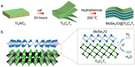 The schematic diagram shows the preparation of MoSe2/O@Ti3C2Tx (a). Schematic design of the catalytic activity of the MoSe2/O@Ti3C2Tx for HER (b). Reproduced with permission [80].
