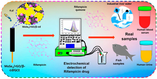 The schematic graph shows the working of MoSe2/rGO/β-cd/GCE for the sensing of rifampicin (RIF) towards real sample research. Reproduced with permission [94].