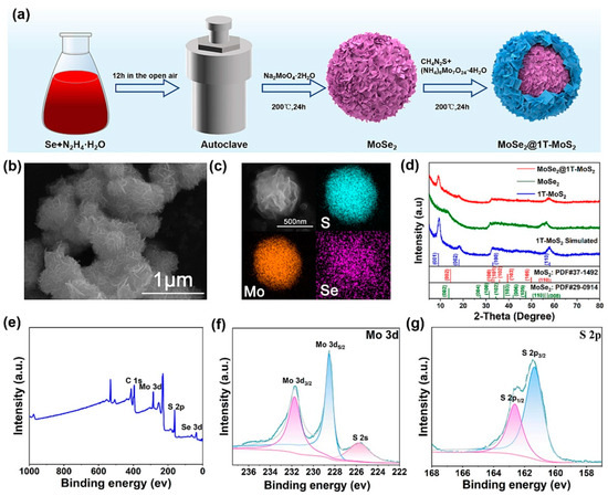 (a) Schematic view for the formation of MoSe2@1T-MoS2. (b) SEM image and (c) EDX mapping results of MoSe2@1T-MoS2. (d) XRD patterns 1T-MoS2, MoSe2, and MoSe2@1T-MoS2. (e) XPS spectrum of MoSe2@1T-MoS2. XPS scan of (f) Mo3d and (g) S2p. Reproduced with permission [98].