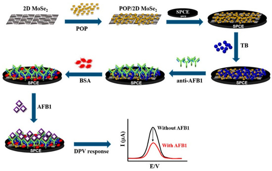 Schematic picture of the construction of TB/POP/2D MoSe2 electrode for the sensing of AFB1. Reproduced with permission [102].