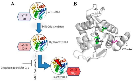 The DJ-1 protein is made up of a single domain that has 198 amino acid residues and a molecular weight of about 20 kDa. This domain shares structural similarities with several bacterial enzyme families, such as ThiJ, which is involved in thiamine biosynthesis, and the Pfp1 protease [4]. Additionally, DJ-1 is homologous with the redox-sensitive chaperone YajL [10]. Numerous researchers determined the three-dimensional structure of DJ-1 by rigorous study a decade ago [7,8,9]. According to these investigations, DJ-1 adopts a compact globular fold and has an active site that is centered around the Cys106 residue. This residue is extremely reactive and prone to oxidation, making it an essential feature of the protein’s functional site (Figure 1B). Furthermore, mutations in DJ-1, such as the Leu166 to Proline (L166P) substitution, have been linked to early-onset Parkinson’s disease. The L166P mutation disrupts DJ-1’s structural integrity, leading to protein destabilization and loss of function, which contributes to neurodegeneration [11]. Cys106 functions as an oxidative stress sensor. It is extremely reactive because of its side chain thiol group (-SH), which can oxidize to several states, such as sulfenic acid and sulfonic acid (highly oxidized), thus inactivating DJ-1. Due to this oxidation, DJ-1 is able to recognize and react to the increase in the reactive oxygen species (ROS), elevated in PD [12] (Figure 1A). Small molecules can be discovered to improve the activity or maintain the active state of DJ-1, enhancing neuroprotection. Olzmann et al., established that DJ-1 exists in solution as a stable dimer [11]. The importance of dimerization for DJ-1 function is further confirmed by the studies on the PD-associated L166P mutation, which prevents dimer formation. This mutation not only inhibits dimerization but also reduces DJ-1’s neuroprotective action, demonstrating that the dimeric form of protein is critical for its biological function [11]. The neuroprotective properties of DJ-1 in counteracting oxidative stress have led to a significant interest in its potential as a therapeutic target for PD. Identifying molecules that stabilize or mimic DJ-1’s antioxidant activity could provide therapeutic benefits in PD. Therapeutic modulation of DJ-1 could also protect against mitochondrial dysfunction, a hallmark of PD pathology. Developing therapies that enhance DJ-1’s protective role or restore its function in mutated forms may offer new avenues for neuroprotection, potentially slowing PD progression [5].