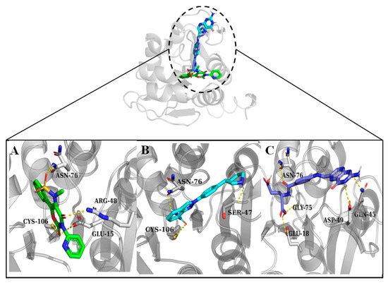 Hydrogen bond interactions between the compounds and DJ-1 active site residues. Residues forming the hydrogen bonds are shown as sticks. (A) Droxicam, (B) niraparib, and (C) pteroylglutamic acid.