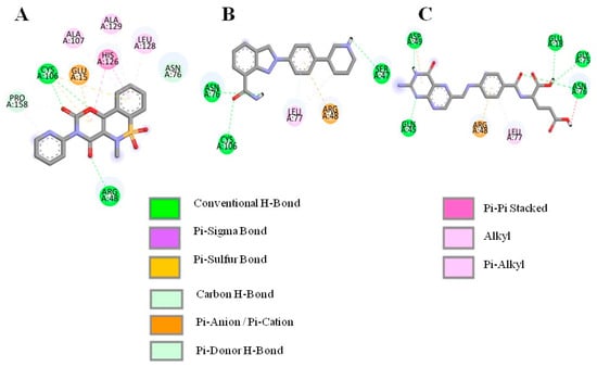 The potential biological activities of the selected compounds were estimated using the PASS online webserver. This tool predicts various biological activities in the human body by calculating the probable activity (Pa) and probable inactivity (Pi) for each compound. The activities relating to Pa > Pi values are presented in Table 3. These results indicate a range of biological properties, including roles in neurodegenerative diseases, enzyme inhibition, and anti-inflammatory effects. Niraparib demonstrated high efficacy as a poly(ADP-ribose) polymerase inhibitor with a Pa value of 0.752 and as a nootropic with a Pa value of 0.755. It also showed activity for neurological disease therapy with a Pa value of 0.38 and antineoplastic enhancement with a Pa value of 0.459. Pteroylglutamic acid is a powerful gamma-glutamyl hydrolase inhibitor (Pa = 0.632), immunostimulant (Pa = 0.576), and thiol oxidase inhibitor (Pa = 0.575). It also has activity in treating autoimmune diseases (Pa = 0.318) and inhibiting MAP3K5 (Pa = 0.371). Droxicam had the highest activity for neurodegenerative disease therapy (Pa = 0.490) and nootropic characteristics. It also showed activities including antiparkinsonian (Pa = 0.372), anti-inflammatory (Pa = 0.472), and anxiolytic (Pa = 0.370).