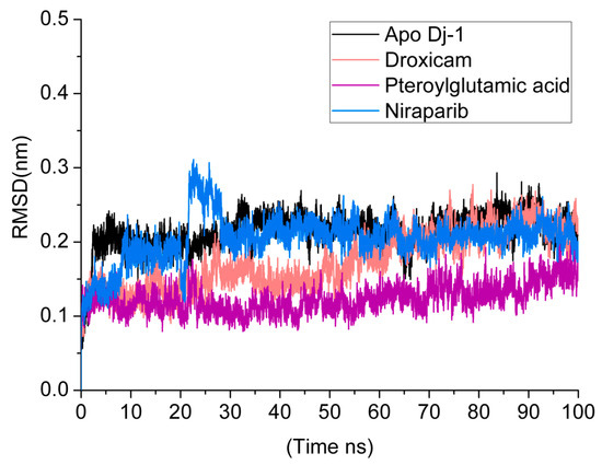 RMSD analysis over a 100 ns Molecular dynamics (MDs) simulation for the DJ-1 protein in its apo form and in complex with three ligands: droxicam, pteroylglutamic acid, and niraparib.