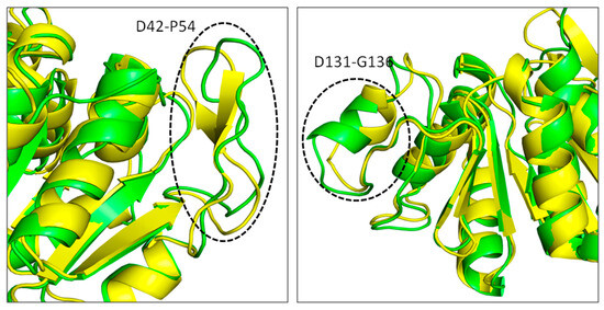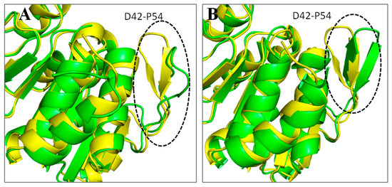 Conformational changes occurred in the DJ–1 structure complexed with pteroylglutamic acid (A) and niraparib (B). Structure extracted at 100 ns in green superimposed to 0 ns yellow.