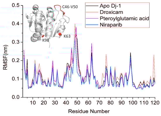 RMSF of the apo DJ–1 and drug bound states for 100ns simulation time. Fluctuating regions of the DJ-1 are shown in red, and residues are labeled.