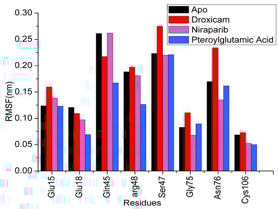 The RMSF provides a detailed view of the flexibility of individual residues in the protein over the simulation time. Residues with higher RMSF values indicate regions of greater flexibility, while lower values correspond to more rigid, stable regions. In the apo form, certain regions of the protein display higher RMSF values, signifying increased flexibility in the absence of a bound ligand. Upon binding to pteroylglutamic acid, RMSF values significantly dropped in areas close to the binding pocket and in residues that interacted with the ligand. This reduction in RMSF values implies that these regions are stabilized by ligand interaction, which reduces their conformational freedom. In comparison to the apo form and other complexes, the RMSF values for the droxicam and DJ-1 complex were higher in certain locations, particularly noticeable in several residues within the active site. As can be seen from the figure, this complex shows higher RMSF values for Glu15, Arg48, Ser47, Gly75, and Asn76 than the other two complexes and the apo form. With an average RMSF value of 0.12 nm, this greater flexibility shows that even though droxicam binds to the protein, it permits greater mobility in specific areas. In the case of the niraparib complex, the RMSF values are lower (average 0.10 nm) than in the apo state. This reduction in flexibility, like that observed with pteroylglutamic acid, points to a stabilizing effect, particularly around the binding site, where the ligand tightly interacts with the protein. Figure 8 represents the RMSF of all the simulated systems. Overall, the RMSF analysis revealed that ligand binding reduced the flexibility of certain protein regions, particularly those involved in direct ligand interactions or within the binding pocket (Figure 9). Gln45 in niraparib exhibits higher fluctuations than the apo and other complexes. This increased flexibility could be attributed to the lack of direct interactions between niraparib and Gln45. This stabilization is crucial for the protein’s structural and functional integrity. However, some peaks remain present in the RMSF plots across all simulated systems, particularly in the region C46–V50, indicating regions that undergo significant conformational changes. Additionally, the RMSF results were consistent with the RMSD results.