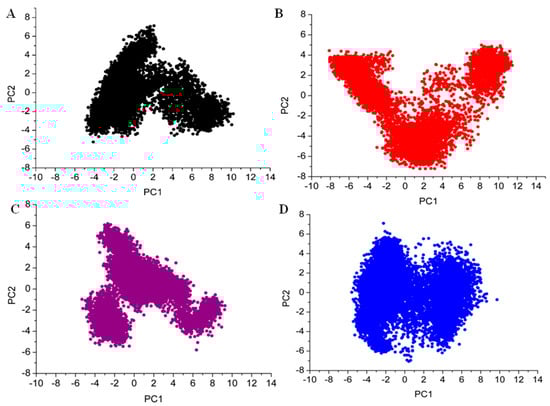 The distribution of data among the first two principal components (PC1 and PC2) of three complexes is represented using Principal Component Analysis (PCA) plots (A) apo, (B) droxicam, (C) pteroylglutamic acid, and (D) niraparib.