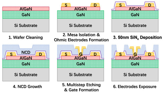 Schematic diagram of the fabrication processes of the NCD passivated GaN HEMTs.