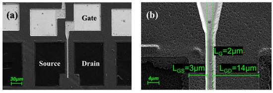 SEM micrographs of the fabricated devices. (a) Overview of the HEMT device with NCD passivation; (b) magnified view of the local 2 μm-gate region area.