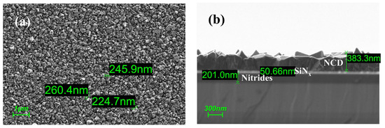 As shown in Figure 3a, SEM images of the sample after NCD passivation show that the NCD grain sizes are primarily around 240 nm, indicating good in-plane uniformity of the growth. The total thickness of the grown NCD layer is 250–383 nm (Figure 3b).