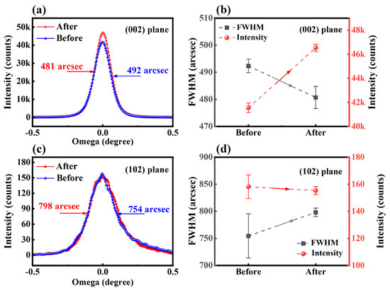 X-ray diffraction results of the prepared sample before and after NCD growth. (a) Comparison of the (002) plane rocking curves; (b) the (002) plane FWHM and peak intensity shift; (c) comparison of the (102) plane rocking curves; (d) the (102) plane FWHM and peak intensity shift.