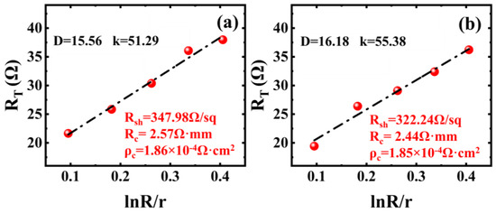 Furthermore, the circular transmission line model (CTLM) test demonstrates that the ohmic contact resistance (Rc) is reduced from 2.57 Ω·mm to 2.44 Ω·mm after NCD growth, as shown in Figure 6. Though this, the Rc is relatively large [36], the ohmic contact formation is confirmed, and its further optimizing will be carried out in the future to reduce this resistance.